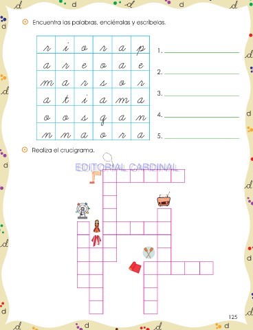 d d d ⵙ Encuentra las palabras, enciérralas y escríbelas. r i o r a p 1. a r e o a e m a r s o r 2. a t i a m a 3. o o s q a n 4. d n n a o r a 5. ⵙ Realiza el crucigrama. d EDITORIAL CARDINAL EDITORIAL CARDINAL d d 125 d d