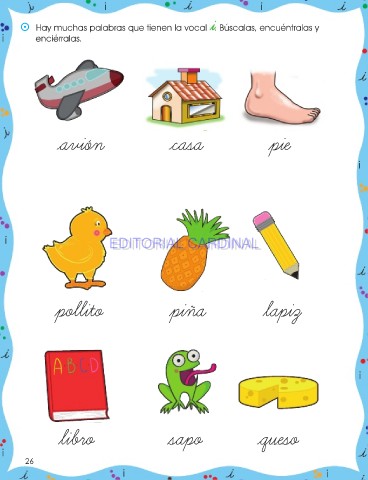 i i ⵙ Hay muchas palabras que tienen la vocal i. Búscalas, encuéntralas y i enciérralas. avión casa pie i i EDITORIAL CARDINAL EDITORIAL CARDINAL pollito piña lapiz i libro sapo queso i 26 i i