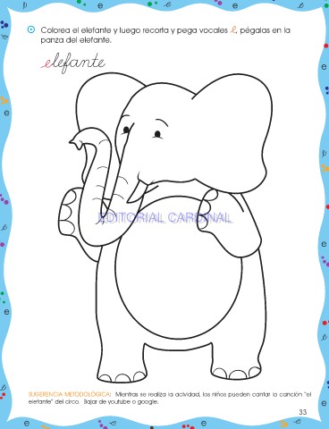 ⵙ Colorea el elefante y luego recorta y pega vocales e, pégalas en la