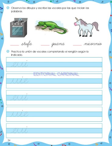 e e ⵙ Observa los dibujos y escribe las vocales por las que inician las palabras. e e ___ stufa ___ guana ___ nicornio ⵙ Practica la unión de vocales completando el renglón según lo indicado. EDITORIAL CARDINAL EDITORIAL CARDINAL e e e 34 e e