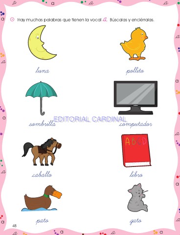 a a ⵙ Hay muchas palabras que tienen la vocal a. Búscalas y enciérralas. luna pollito a a EDITORIAL CARDINAL computador sombrilla EDITORIAL CARDINAL caballo libro a a pato gato 48 a a