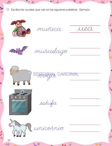 o a ⵙ Escribe las vocales que van en las siguienes palabras. Ejemplo: u e a EDITORIAL CARDINAL EDITORIAL CARDINAL i o 50 a u