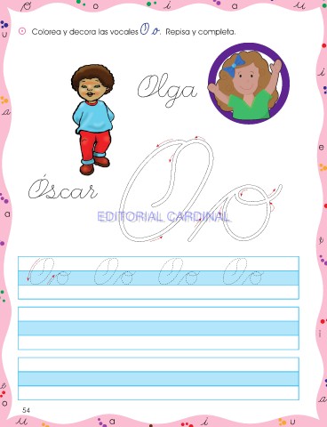 o a u ⵙ Colorea y decora las vocales O o. Repisa y completa. e a EDITORIAL CARDINAL EDITORIAL CARDINAL i o 54 a u