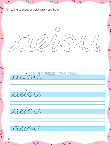 o a ⵙ Lee la secuencia, coloréala y escríbela. u e a EDITORIAL CARDINAL EDITORIAL CARDINAL i o 56 a u