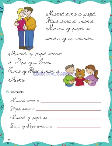m p m Mamá ama a papá. Papá ama a mamá. Mamá y papá se aman y se miman. Mamá y papá aman m a Pepe y a Ema. Ema y Pepe aman a p EDITORIAL CARDINAL EDITORIAL CARDINAL Mimi. ⵙ Completa. Mamá ama a Papá ama a p Mamá y papá se Ema y Pepe aman a m 70 p m