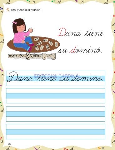 d d ⵙ Lee, y copia la oración. d Dana tiene su dominó. d Dana tiene su dominó. d EDITORIAL CARDINAL EDITORIAL CARDINAL d d 98 d d