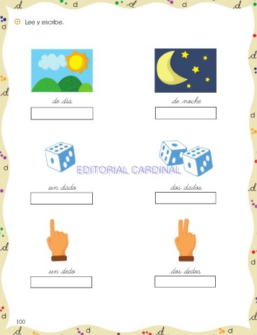 d d ⵙ Lee y escribe. d de día de noche d d EDITORIAL CARDINAL EDITORIAL CARDINAL un dado dos dados d un dedo dos dedos d 100 d d