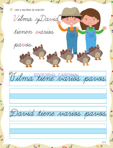 d d ⵙ Lee y escribe la oración d Vilma yDavid tienen varios pavos. d d EDITORIAL CARDINAL Vilma tiene varios pavos. EDITORIAL CARDINAL David tiene varios pavos. d d 111 d d