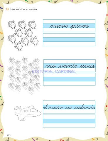 d d ⵙ Lee, escribe y colorea. d nueve pavos d veo veinte uvas d EDITORIAL CARDINAL EDITORIAL CARDINAL el avión va volando d d 112 d d