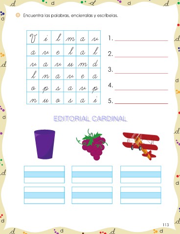 d d ⵙ Encuentra las palabras, encierralas y escríbelas. d V i l m a v 1. a v e l a l 2. v a v u m d 3. l n a v e a d o p s a v p 4. n u o s a i 5. d EDITORIAL CARDINAL EDITORIAL CARDINAL d d 113 d d