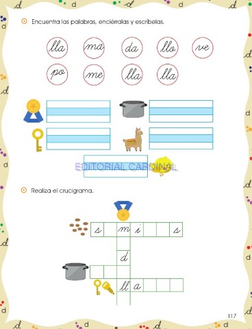 d d ⵙ Encuentra las palabras, enciérralas y escríbelas. d lla ma da llo ve po me lla lla d d EDITORIAL CARDINAL EDITORIAL CARDINAL ⵙ Realiza el crucigrama. s m i s d d ll a d 117 d d