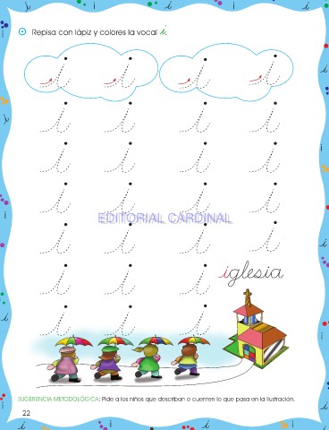 i i i ⵙ Repisa con lápiz y colores la vocal i. i i EDITORIAL CARDINAL EDITORIAL CARDINAL i SUGERENCIA METODOLÓGICA: Pide a los niños que describan o cuenten lo que pasa en la ilustración. i 22 i i