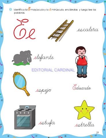 e e ⵙ Identifica la E mayúscula y la e minúscula, enciérralas y luego lee las palabras. Ee e e EDITORIAL CARDINAL EDITORIAL CARDINAL e Eduardo e e 29 e e
