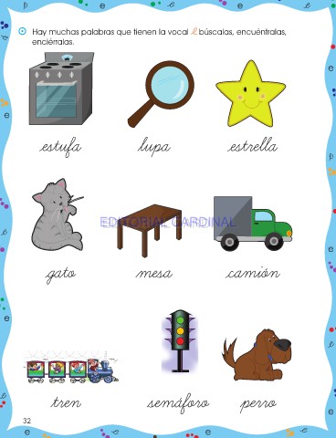 e e ⵙ Hay muchas palabras que tienen la vocal e búscalas, encuéntralas, enciérralas. e e estufa lupa estrella EDITORIAL CARDINAL EDITORIAL CARDINAL e gato mesa camión e tren semáforo perro e 32 e e