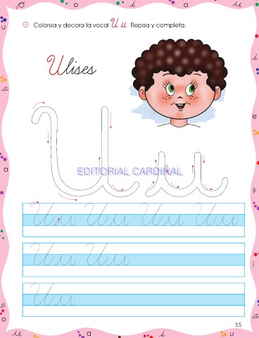 o a u ⵙ Colorea y decora la vocal U u. Repisa y completa. Ulises e a EDITORIAL CARDINAL EDITORIAL CARDINAL i o 55 a u