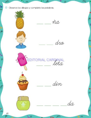 m p ⵙ Observa los dibujos y completa las palabras. m ña dro m p EDITORIAL CARDINAL leta EDITORIAL CARDINAL dín p da m 68 p m