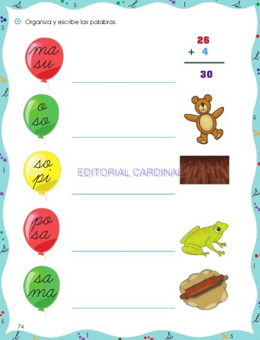 s l ⵙ Organiza y escribe las palabras. s ma 26 + 4 su 30 o so s so pi EDITORIAL CARDINAL l EDITORIAL CARDINAL po sa sa l ma s 74 l s