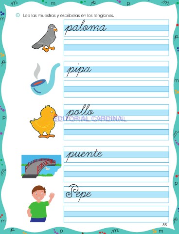m p ⵙ Lee las muestras y escríbelas en los renglones. m paloma pipa m pollo p EDITORIAL CARDINAL EDITORIAL CARDINAL puente p Pepe m 85 p m