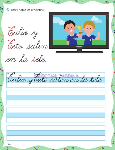 n t ⵙ Lee y copia las oraciones. n T Tulio y T Tito salen n en la tele. T t T EDITORIAL CARDINAL ulio y ito salen en la tele. EDITORIAL CARDINAL t n 94 t n